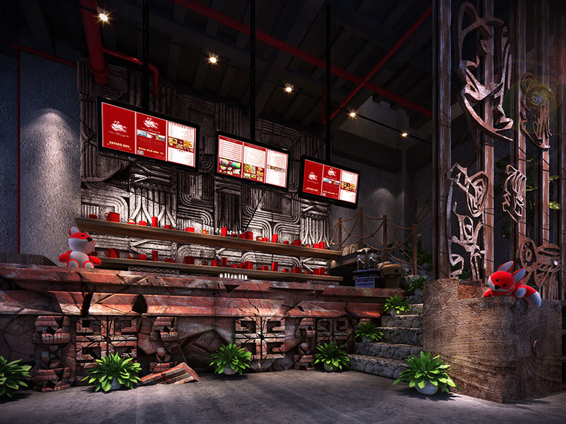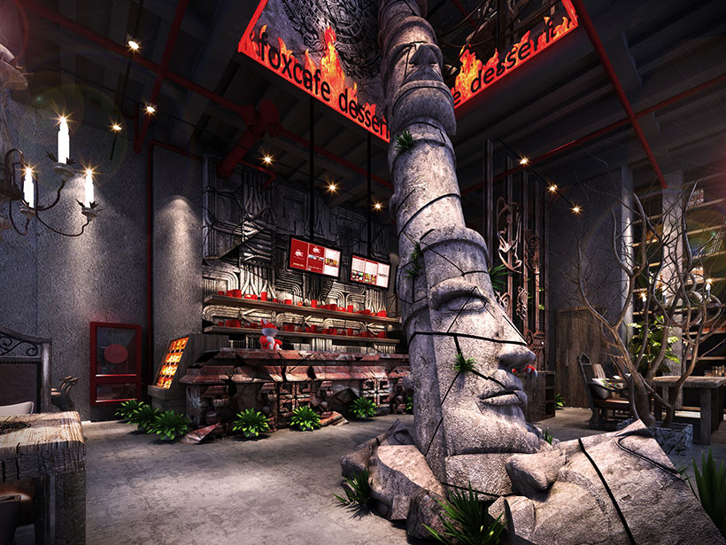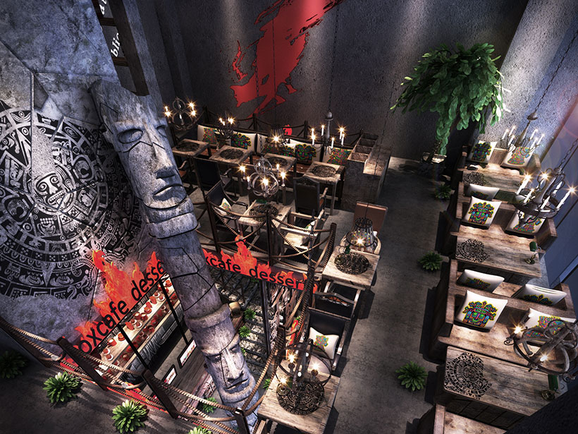 運(yùn)用破碎的瑪雅建筑紋理作為主元素貫穿整體空間設(shè)計(jì),將消失的瑪雅文化融入到現(xiàn)代主義的設(shè)計(jì)風(fēng)格里,用藝術(shù)化自然化的設(shè)計(jì)手法將簡陋的空間置換為國際潮流空間設(shè)計(jì)風(fēng)尚。設(shè)計(jì)師依舊沿襲 簡的理念,僅用一根從底層直穿二樓的人面雕塑就巧妙規(guī)避了空間的局促感,成為整體空間設(shè)計(jì) 凝練的一筆。