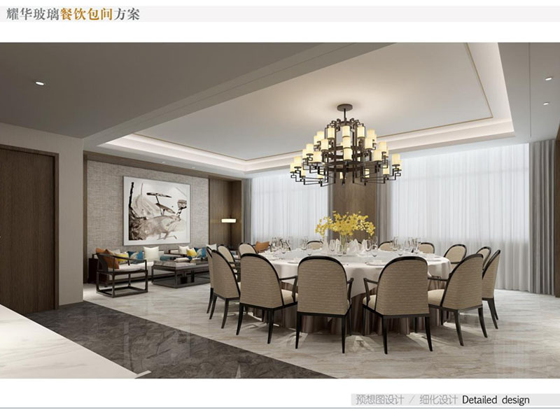 設計理念: 耀華玻璃餐飲包間裝修效果將現(xiàn)代與雅致的風格混搭。包間內采用柔和的燈光與精致的裝飾,營造出溫馨舒適的用餐氛圍。墻面選用高質量的裝飾玻璃,既美觀又實用,同時展現(xiàn)了耀華玻璃的產品特色,為顧客提供愉悅的用餐體驗。