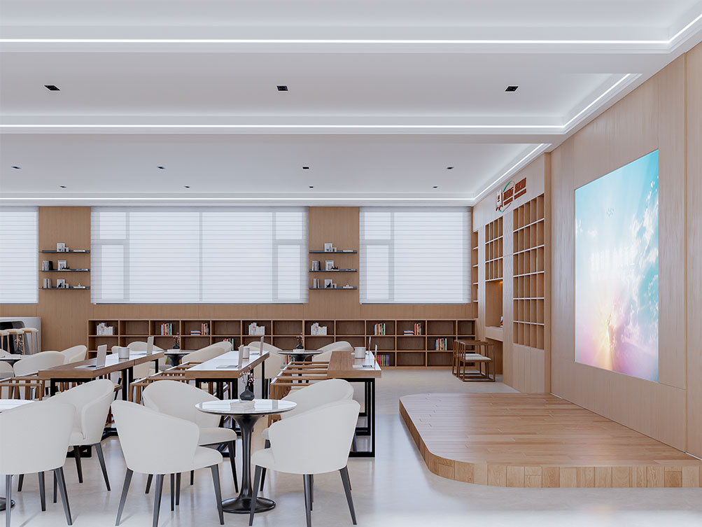臨清國(guó)網(wǎng)職工之家裝修效果以 “溫馨實(shí)用 + 電力特色” 為核心,整體采用暖白、淺藍(lán)為主色調(diào),搭配國(guó)網(wǎng)標(biāo)志性的紅色元素點(diǎn)綴。空間劃分上,既有配備舒適沙發(fā)、綠植與書(shū)籍的休閑區(qū),方便職工放松休憩;也有設(shè)置乒乓球桌、健身器材的運(yùn)動(dòng)區(qū),滿足日常鍛煉需求;同時(shí)融入電力主題細(xì)節(jié),如墻面掛置電網(wǎng)作業(yè)場(chǎng)景裝飾畫、角落擺放小型電力設(shè)備模型,凸顯行業(yè)屬性;功能區(qū)還兼顧實(shí)用性,茶水間配備齊全廚具,活動(dòng)區(qū)預(yù)留靈活桌椅組合,可滿足職工聚餐、小型活動(dòng)等需求,整體營(yíng)造出兼具歸屬感與行業(yè)辨識(shí)度的溫馨空間,切實(shí)服務(wù)職工日常。