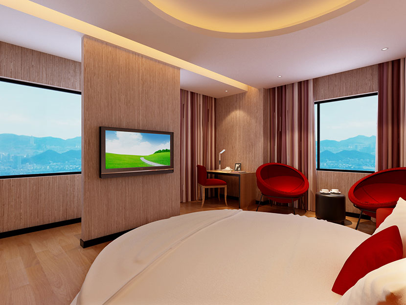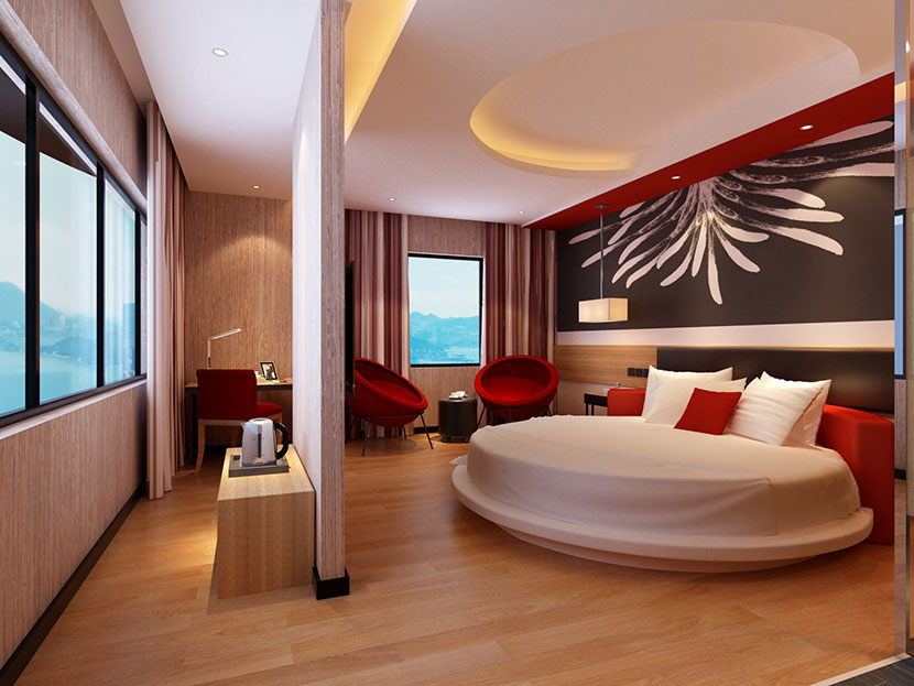 圓床房裝修效果獨特而浪漫,以圓形為主題設(shè)計。床頭背景墻采用柔和的色調(diào)與溫馨材質(zhì),利用鮮艷的紅色搭配軟包,圓形的床架搭配舒適的床墊與抱枕,不僅視覺上新穎別致,更提供了全方位的舒適體驗。房間內(nèi)燈光設(shè)計柔和,通過壁燈、臺燈以及可調(diào)光的主燈,營造出浪漫溫馨的氛圍,讓情侶們共度美好時光。整體裝飾簡潔而不失精致,每一處細(xì)節(jié)都透露著對浪漫與舒適的追求。